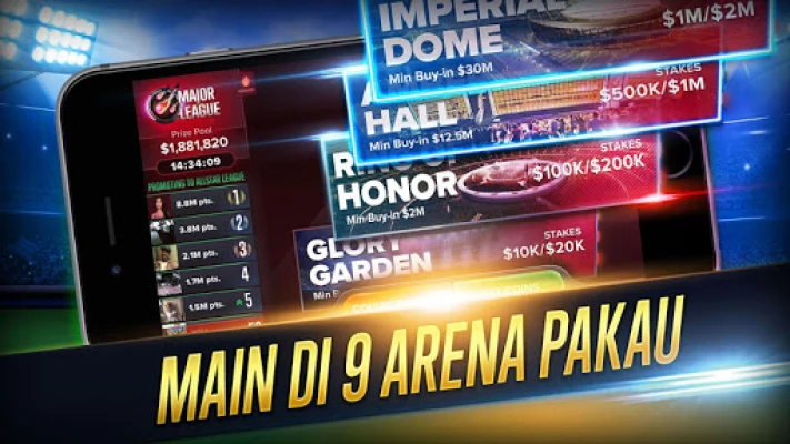 Sistem pertandingan berasaskan liga kami menawarkan pengalaman yang jauh lebih mendalam berbanding permainan poker biasa. Mulakan perjalanan anda di arena pemula dan berusaha keras untuk mencapai 'Promotion Zone', membuka pintu ke liga yang lebih tinggi. Bersainglah di samping pemain dari seluruh dunia, atau cabar rakan-rakan anda sendiri. Sama ada anda memilih untuk bersembunyi di sebalik identiti tanpa nama atau mempamerkan status Bintang Poker anda melalui profil Facebook, setiap tangan adalah peluang untuk menipu lawan dan mengukir nama anda. Gunakan fungsi Jemputan di meja untuk menarik rakan anda ke dalam pertempuran strategik. Terokai sembilan arena berbeza, masing-masing dengan suasana uniknya, dari 'Victory Cage' yang sengit hingga ke 'Ring of Honor' yang berprestij.