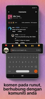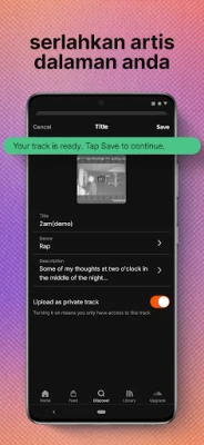 SoundCloud lebih daripada sekadar sebuah aplikasi; ia adalah komuniti muzik global yang bertenaga. Temui lagu eksklusif, set DJ yang memukau, dan adunan semula yang tidak akan anda jumpai di platform penstriman lain. Bina perpustakaan muzik impian anda dengan menyimpan lagu-lagu trending, karya bawah tanah yang tersembunyi, dan potongan dalam yang mendalam. Berhubung dengan artis kegemaran anda, sertai perbualan bersama peminat lain, dan kongsi senarai main yang menginspirasi. Malah, pencipta boleh memuat naik muzik mereka sendiri secara langsung ke SoundCloud, menjangkau pangkalan peminat global yang berjuta-juta, dan membentuk landskap bunyi masa kini.